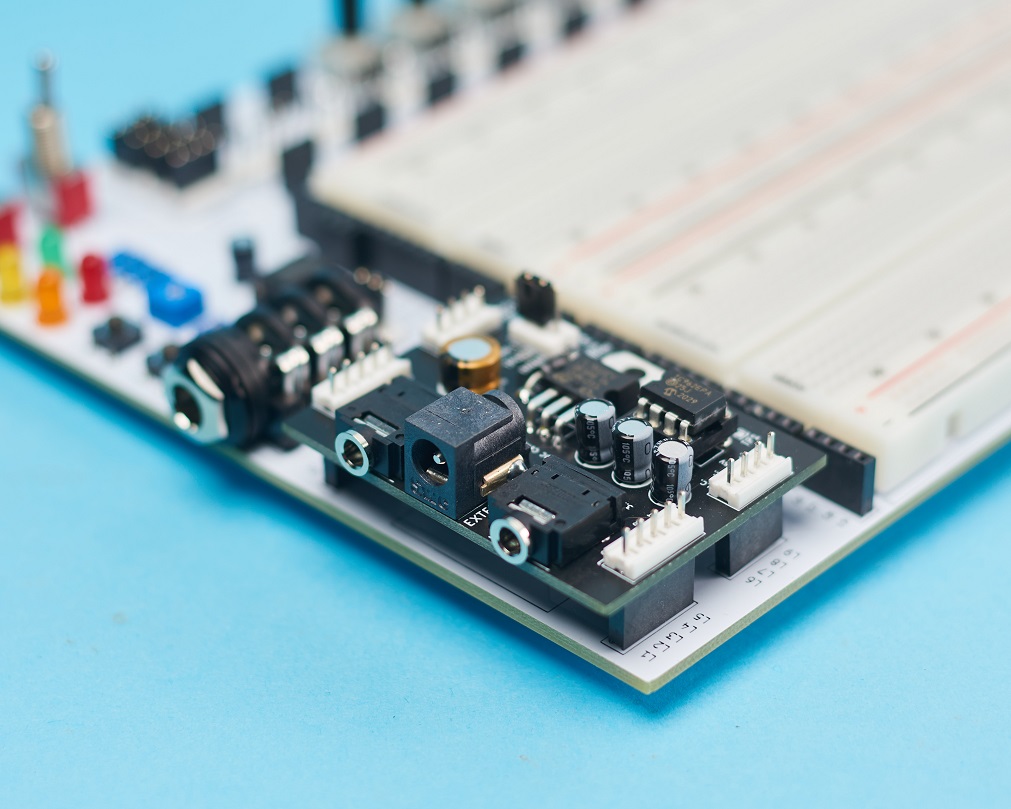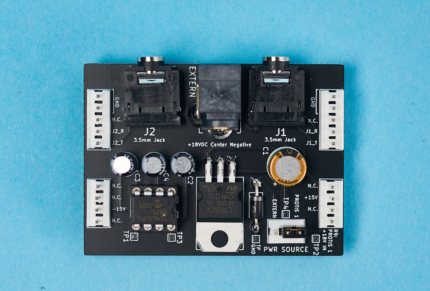The Eurorack Module (Modular-Synth Module) board allows you to design modular synth circuits. The standard Eurorack voltage is +/- 12VDC, which is already offered on the PROTIS 1 board. Though, many modular synth circuits found online may feature +/- 15VDC power rails. The Eurorack Module board houses two (2) 3.5mm jacks and a split 15VDC rail.